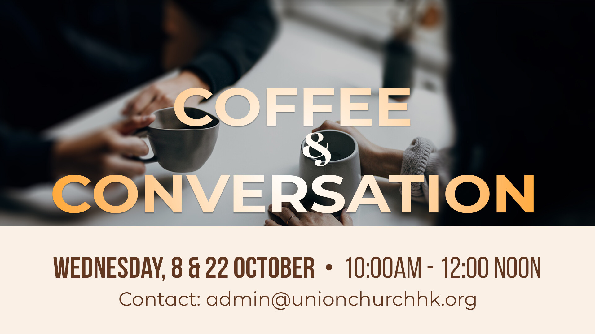 Coffee & Conversation, Wednesday 8 & 22 October, 10:00am-12:00pm, this will take place every two weeks at Union Church, 22A Kennedy Road, Mid-Levels. We invite you to come join us for this time of fellowship. To register your interest please contact