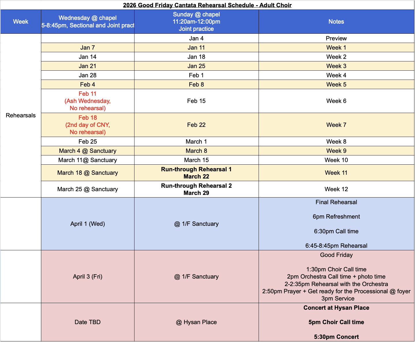 - A minimum of 8 out of 23 rehearsals (Sunday and/or Wednesday) from January 4 to March 8 are mandatory, and 1 out of 3 run-through rehearsals (including the final rehearsal) are also expected for all singers if they wish to take part in the Cantata.