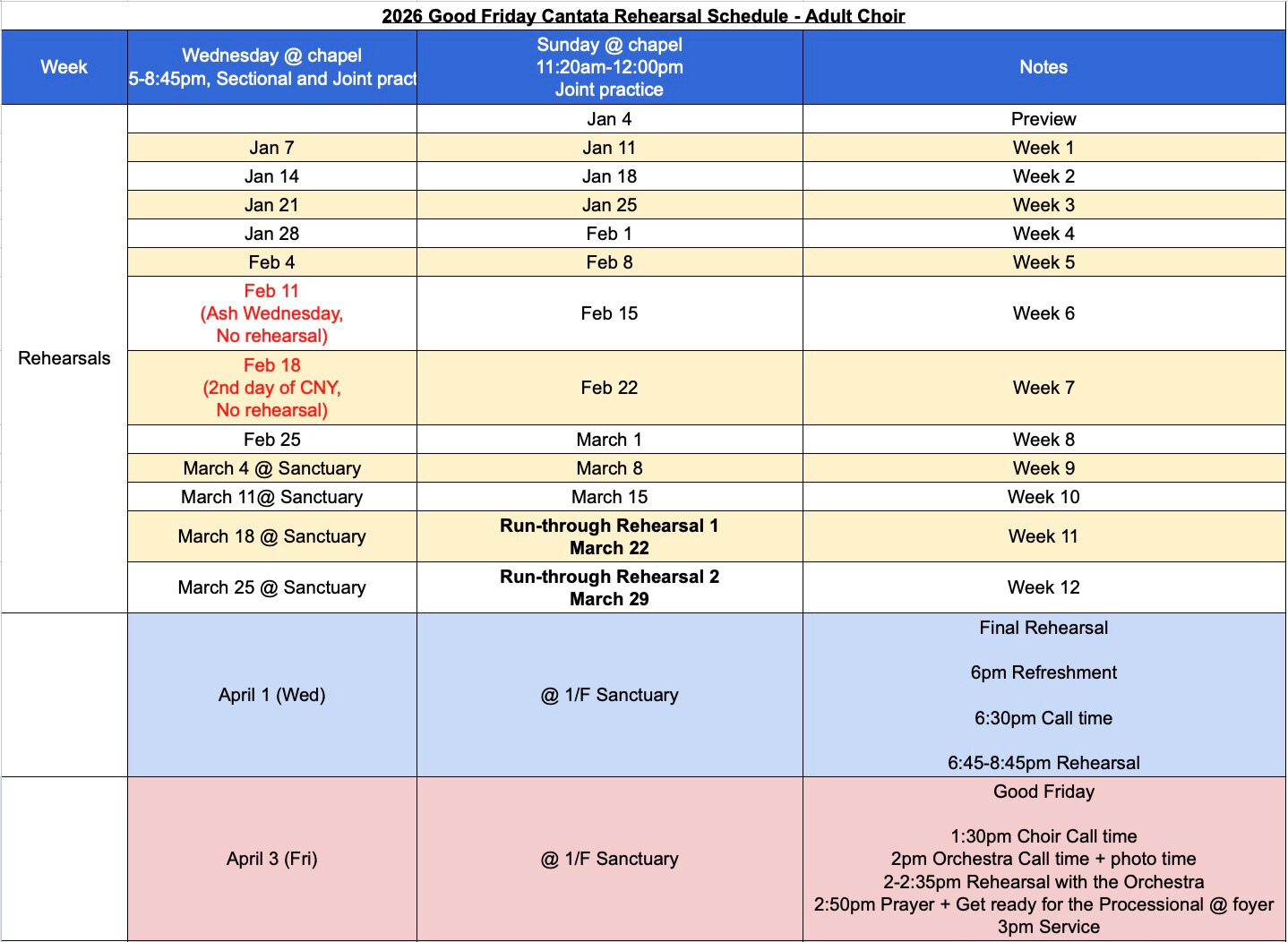 - Please refer to the Rehearsal Schedule for specific dates, time, and venue.
