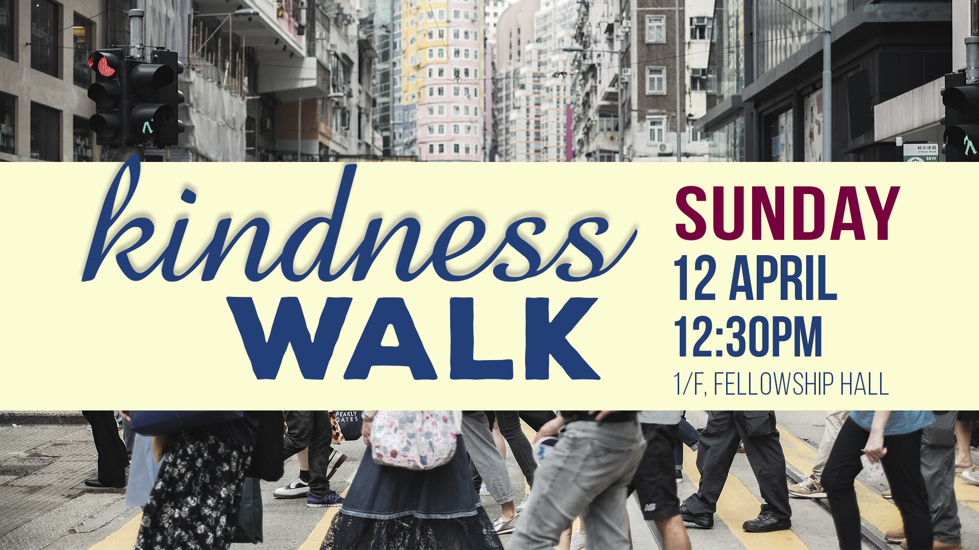 Kindness Walk12 April, 2026 12:30pmKindness Walk, Sunday 12 April, 12:30 - 2pm. Anyone is welcome to join and you do not need to register. Let's go to send blessings & love on our Wan Chai neighbours! Meet on the 1/F, Fellowship Hall near the kitchen. Questions? Contact . Add to Calendar