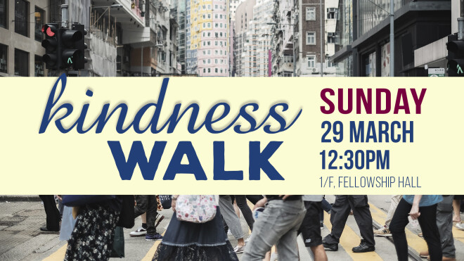 Kindness Walk, Sunday 29 March, 12:30 - 2pm. Anyone is welcome to join and you do not need to register. Let's go to send blessings & love on our Wan Chai...