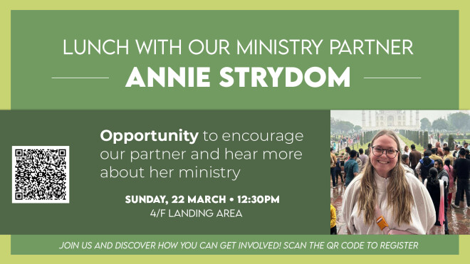 Evening of Prayer: join us in prayer on Wednesday, 7:00PM - 8:15pm in the 4/F Conference Room for an evening of prayer. Consider how God is moving and will continue...
